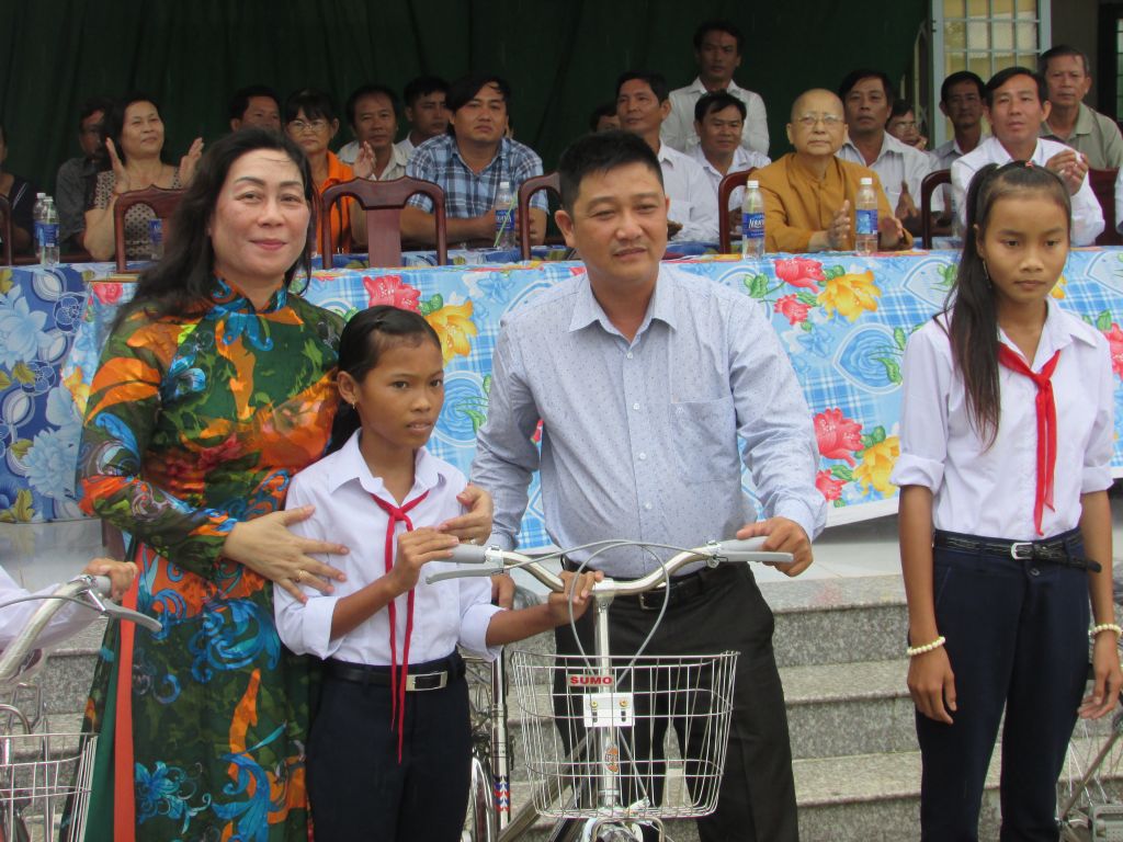 Cô Lê Thị Vệ - UVTV Tỉnh ủy, Chủ tịch UBMTTQ tỉnh trao xe đạp cho học sinh nghèo hiếu học. Ảnh: LH