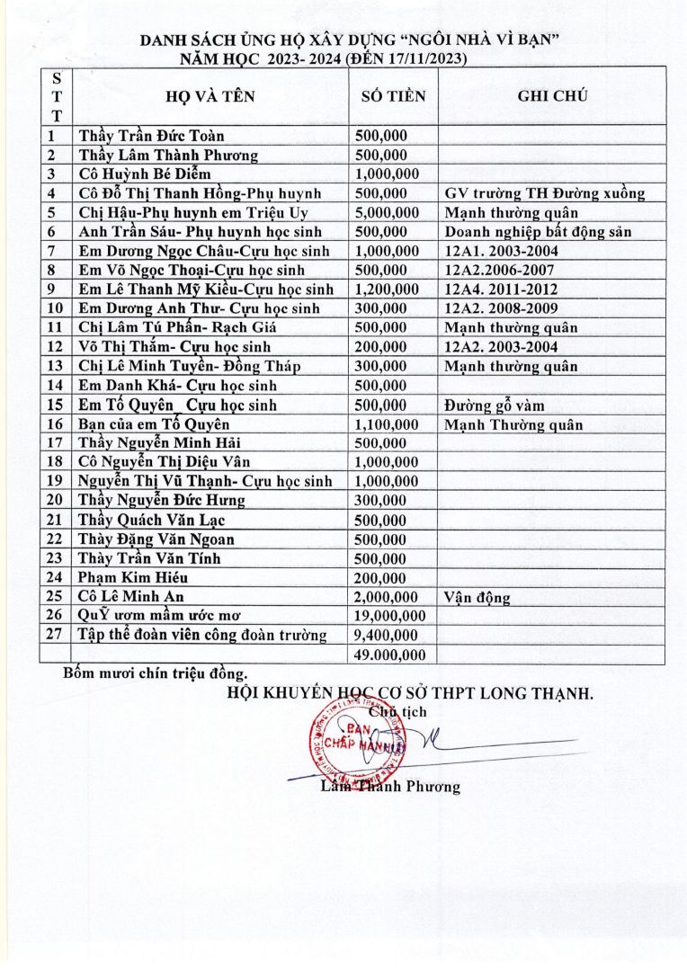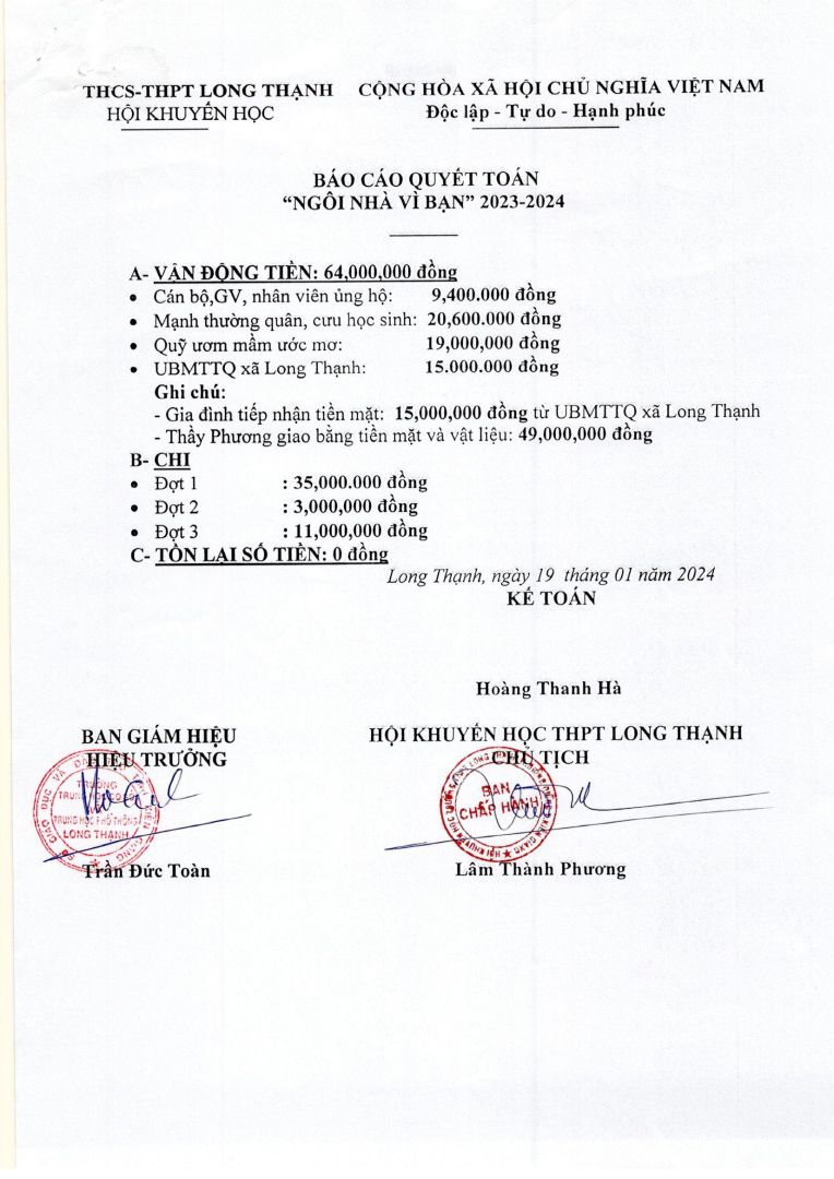Trường THCS&THPT Long Thạnh xin công khai thu chi vận động "Ngôi nhà Vì Bạn" năm học 2023-2024 (cho 2 em Lê Trung Hiếu lớp 8A3 và em Lê Đức Hạnh lớp 7A3). Thay mặt Tập thể nhà Trường xin chân thành quý mạnh thường quân, quý Cha mẹ học sinh, quý Thầy Cô và các em cựu học sinh, các em học sinh đã cùng với nhà trường cất nhà cho hai bạn. Xin chân thành cảm ơn thật nhiều.