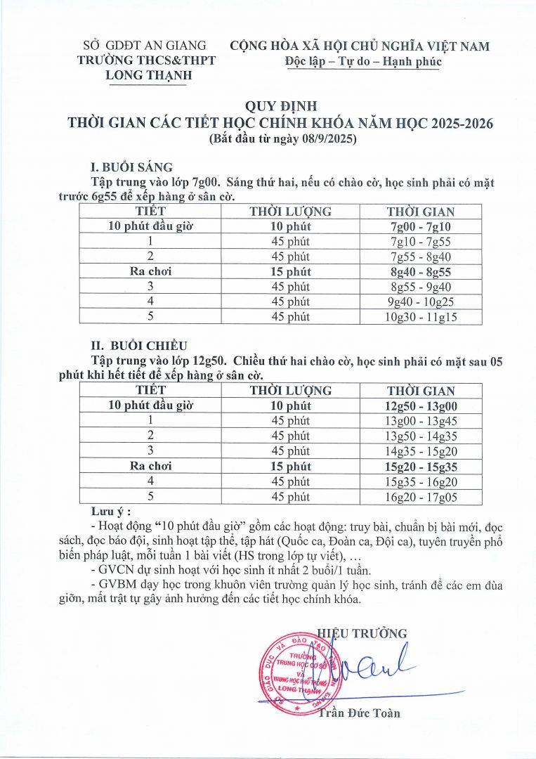 [THÔNG BÁO] THỜI GIAN CÁC TIẾT HỌC CHÍNH KHÓA NĂM HỌC 2025-2026