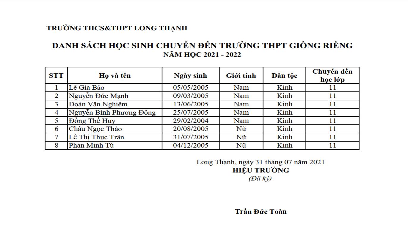 DANH SÁCH HỌC SINH CHUYỂN ĐẾN TRƯỜNG THPT GIỒNG RIỀNG NĂM HỌC 2021-2022