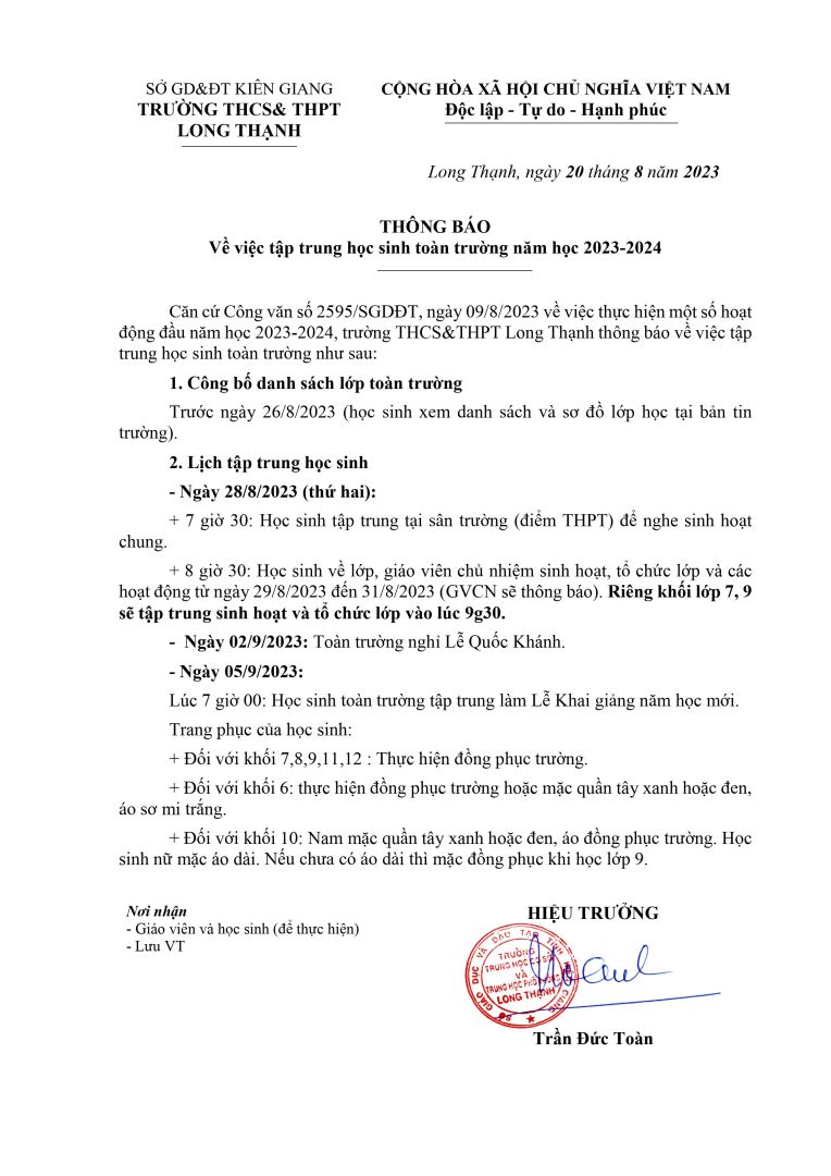 THÔNG BÁO VỀ VIỆC TẬP TRUNG HỌC SINH TOÀN TRƯỜNG NĂM HỌC 2023-2024